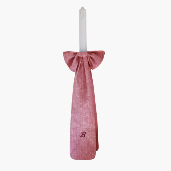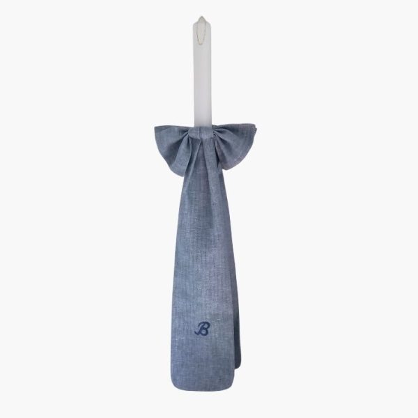 Λαμπάδα βάπτισης με υφασμάτινο φιόγκο με σχέδιο πλακέ. Το ύφασμα είναι της επιλογής σας και έχετε τη δυνατότητα προσθήκης κεντητού μονογράμματος ή ονόματος.